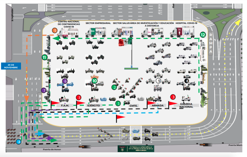 El desfile militar se concentrará en la zona del primer cuadro de la Ciudad; será transmitido por televisión o las redes sociales. Para ello, el acceso al Zócalo será restringido, no se colocarán gradas, no habrá invitados especiales ni público general, y tampoco participarán planteles educativos