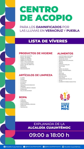 Ciudad de México.- En un acto de solidaridad con las familias afectadas por las recientes lluvias en los estados de Veracruz y Puebla, la Alcaldía Cuauhtémoc anunció la apertura de un centro de acopio en la explanada principal del edificio sede, donde ya se reciben víveres y artículos de primera necesidad destinados a las comunidades damnificadas.