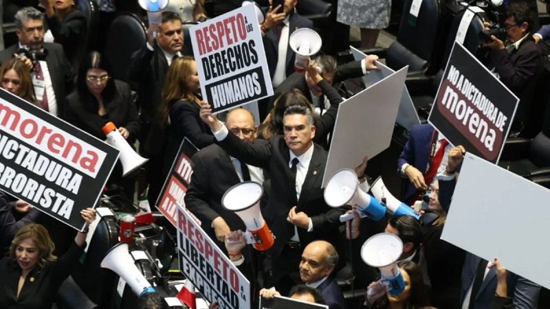 Ante ello, la postura de la petista se vio interrumpida por varios minutos ante el ruido que generaban los megáfonos y con las pancartas que señalaban: “respeto a los derechos humanos”, “México despierta”, “no al narco gobierno de Morena”.