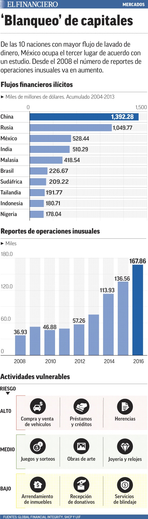 Pero como dice un colega del periódico especializado en economía, El Financiero, aquel que fundamos bajo la batuta de Rogelio Cárdenas Pérez y su hijo casi homónimo, Rogelio Cárdenas Sarmiento, tanto cuidan las llamadas autoridades mexicanas el ‘lavado de dinero’ en México, que sigue creciendo. Un estudio de Global Financial Integrity ubica a México como el tercer país en el mundo con mayor flujo de capitales de procedencia ilícita, con un monto estimado de entre 50 y 60 mil millones de dólares al año. Sólo es superado por China y Rusia, con 139 mil y 105 mil millones de dólares en promedio por año.