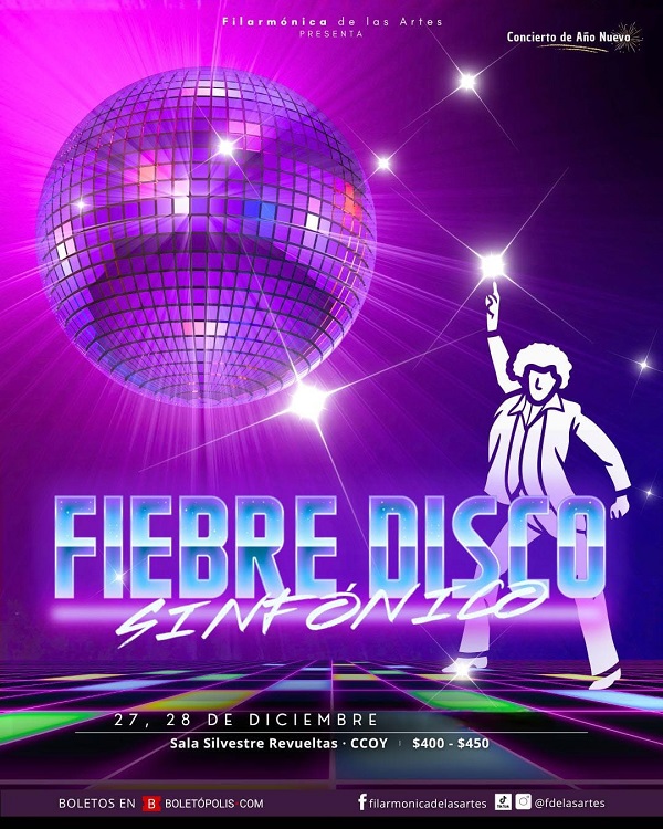 ¿Y qué tal si para variar un poco la temática de la música decembrina, los villancicos y las canciones navideñas, escuchamos algo de música disco? Pues si se les antoja cambiar de género, la Filarmónica de las Artes, ofrecerá el espectáculo “Fiebre de Disco Sinfónico”. Es un concierto para celebrar el Año Nuevo con arreglos sinfónicos a temas por muchos conocidos: “I Will Survive”, “Last Dance”, “Night Fever” y “Can’t Take My Eyes Off Of You”, entre otros éxitos de la década de los 70 en el siglo pasado.