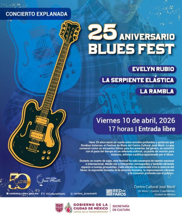 Adicionalmente, en el foro ubicado en Dr. Mora 1, en el Centro Histórico de la CDMX, actuará, además, la agrupación originaria de la ciudad de Puebla, Serpiente Elástica que tiene 20 años de trayectoria y cuatro discos. Juntos, proveerán de música y alegría a esta celebración del blues, debido a que el Centro Cultural José Martí, a lo largo de 25 años de historia, ha sido pieza fundamental para la promoción de este género musical.