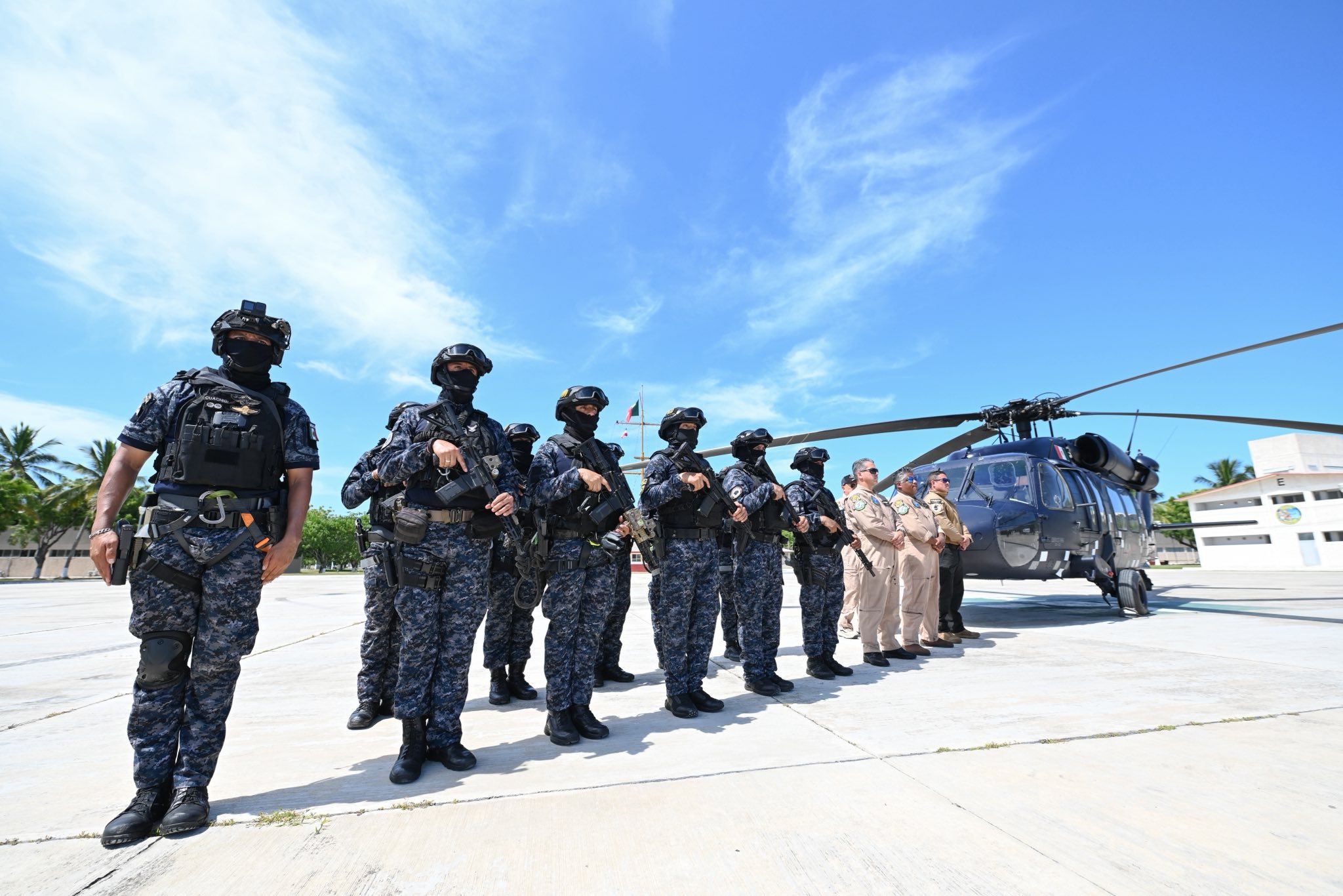 El helicóptero Black Hawk UH-60, primero en su tipo en el sureste, puede transportar a 14 elementos, dos artilleros, pilotos y equipo médico, y cuenta con blindaje nivel 6, vuelo nocturno, bengalas antimisiles y velocidad de 250 km/h. Mientras que las lanchas Monster tienen internet satelital, ametralladoras y siete horas de autonomía para operaciones de rescate y vigilancia.