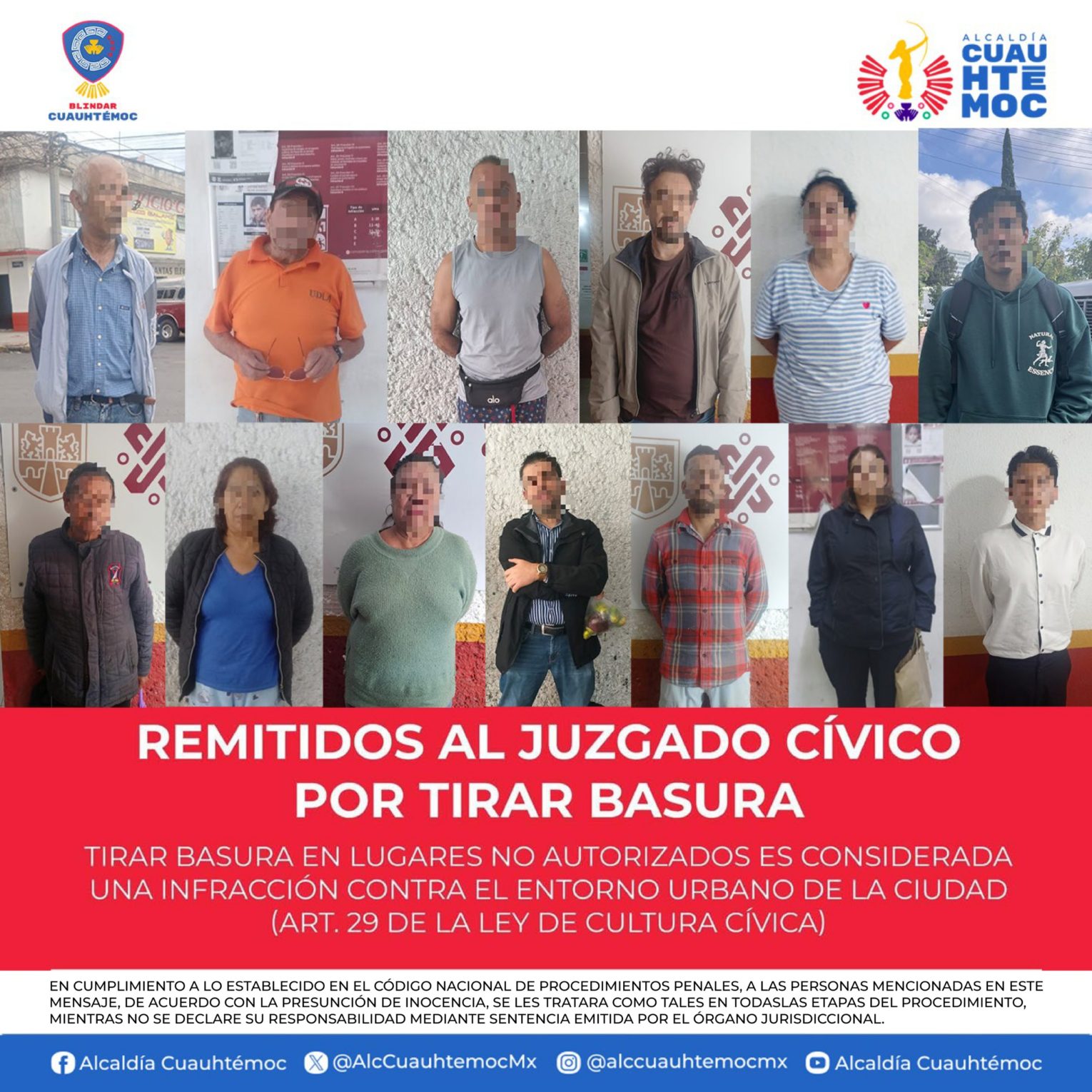 Ciudad de México.- Durante el fin de semana, 13 personas fueron sorprendidas por elementos de la Policía Auxiliar adscritos a la Alcaldía Cuauhtémoc cuando tiraban basura en la vía pública. Los hechos ocurrieron en las colonias Santa María la Ribera, Obrera y Doctores, donde los infractores fueron remitidos ante el Juzgado Cívico correspondiente.