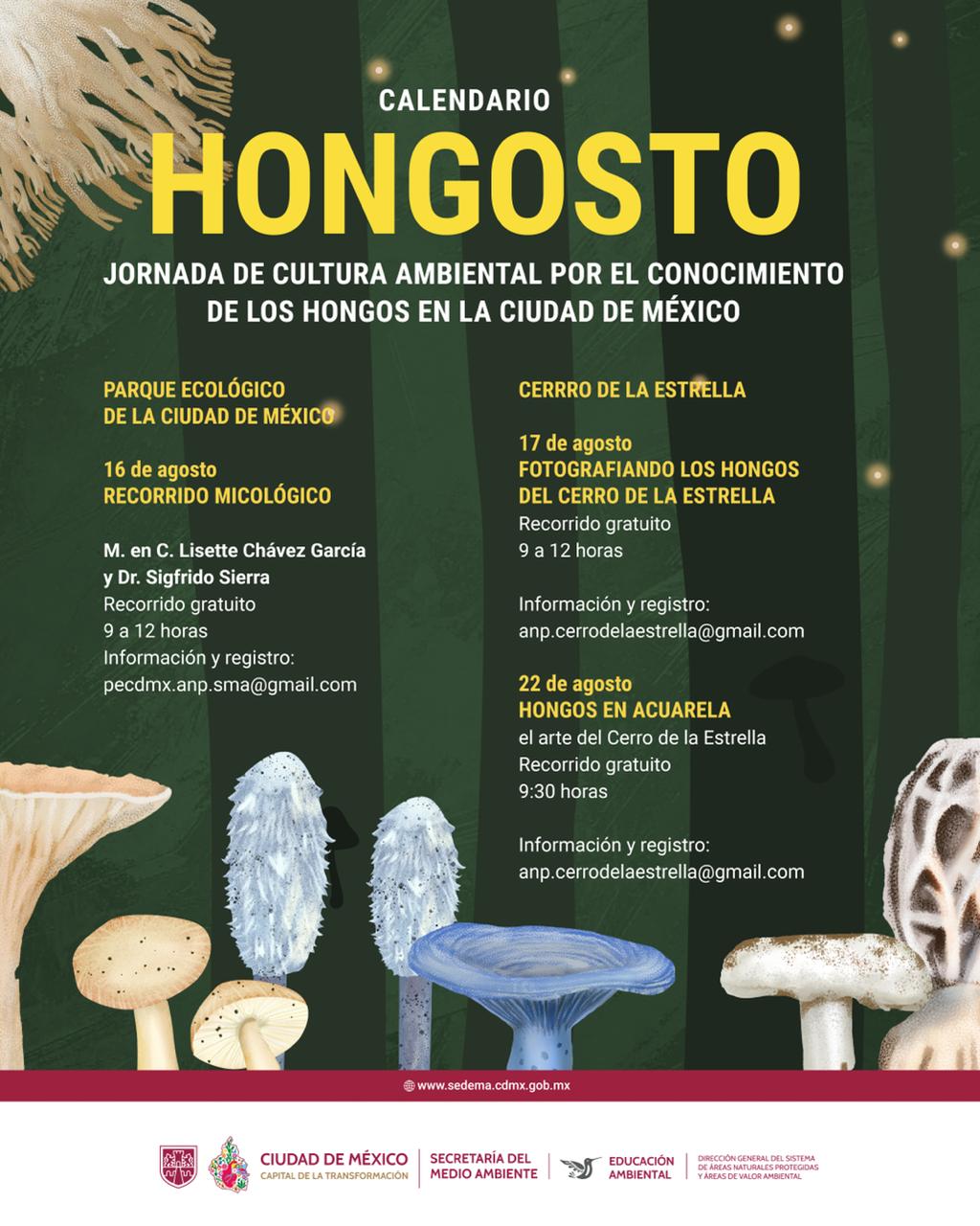 Del 16 de agosto al 20 de septiembre, parques y centros culturales albergarán actividades gratuitas y con cupo limitado. El evento arrancará el 16 de agosto en el Parque Ecológico de la Ciudad de México con un recorrido micológico guiado por la M. en C. Lisette Chávez García y el Dr. Sigfrido Sierra, expertos que revelarán secretos sobre la biodiversidad fúngica. Para participar, los interesados deben enviar un correo a pecdmx.anp.sma@gmail.com.