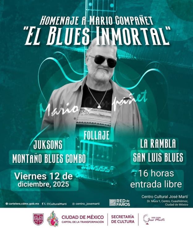 En el homenaje previsto para este viernes 12 de diciembre, se contará con la participación de las agrupaciones San Luis Blues, Montaño Blues Combo y La Rambla, procedentes del Estado de México; y Juksons y Follaje, de la CDMX. El acceso es gratuito y la cita es en Dr. Mora 1, colonia Centro, Alcaldía Cuauhtémoc, frente a la Alameda Central en la CDMX.