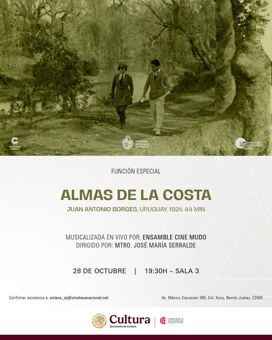 La apertura de la muestra se realizará el martes 28 de octubre a las 19:30 horas, en la Sala 3 de la Cineteca Nacional, con la proyección de Almas de la costa (1924), dirigida por Juan Antonio Borges. La función contará con musicalización en vivo a cargo del Ensamble Cine Mudo, bajo la dirección del maestro José María Serralde, evocando la atmósfera del cine silente de inicios del siglo XX.