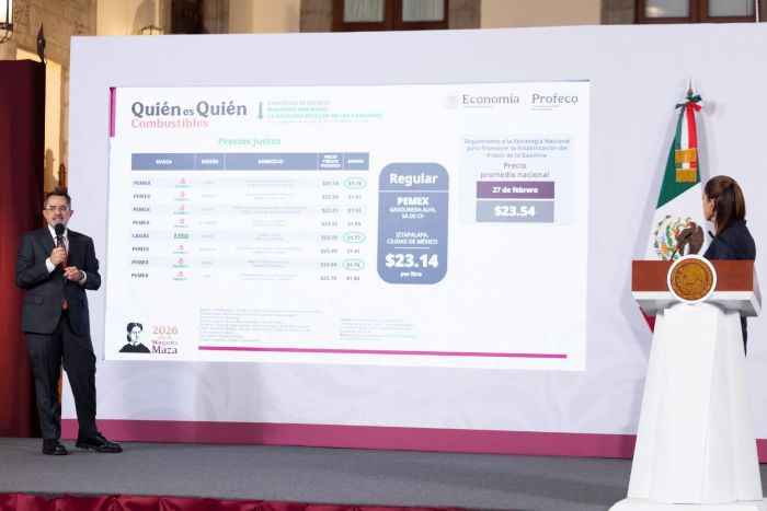 El titular de la institución señaló durante su participación en la conferencia Mañanera del Pueblo, que encabeza la Presidenta de México, Claudia Sheinbaum Pardo, que el precio por litro el 27 de febrero fue $23.54 pesos.