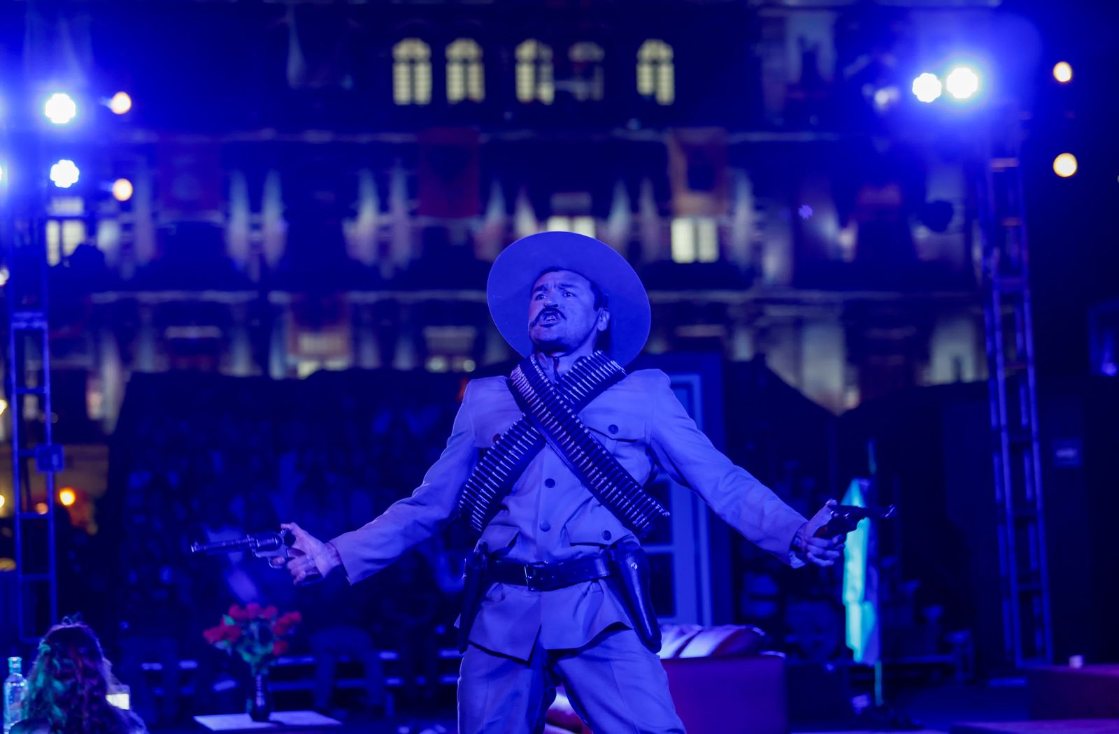 Las funciones de 90 minutos se presentaron en un escenario adaptado para la plaza pública más emblemática del país, con efectos especiales, escenografía y el bolero “Desdichadamente” de María Luisa Landín como parte central de la narrativa.