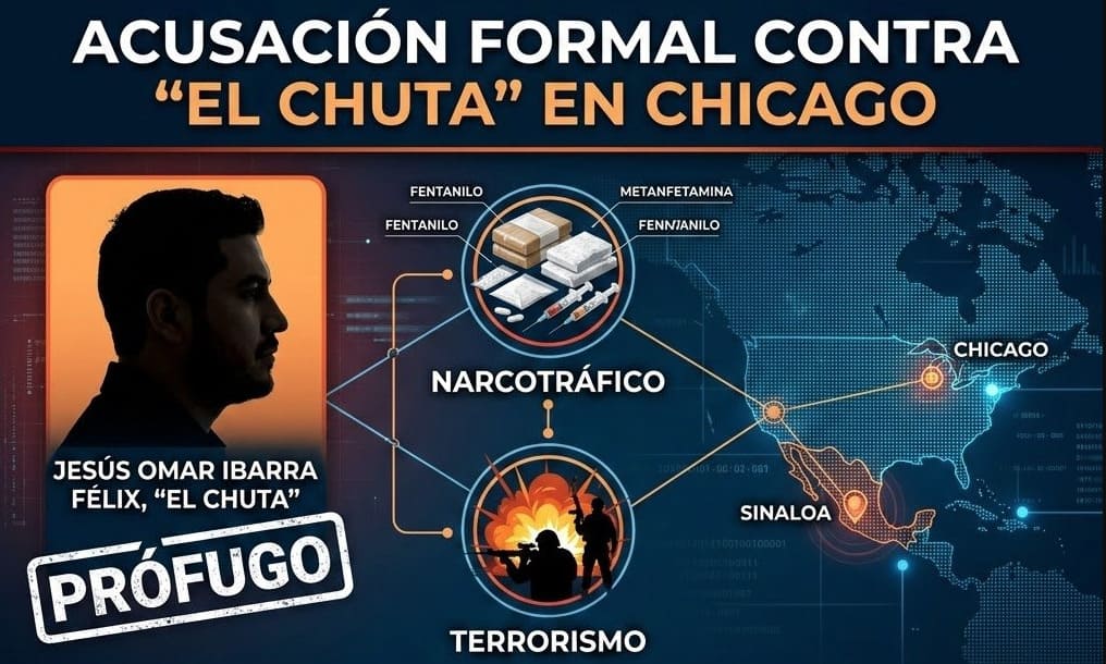 “La acusación formal imputa a Ibarra Félix, también conocido como El Chuta, de 49 años y residente de Los Mochis, México, por terrorismo, drogas y posesión de armas de fuego. Los cargos conllevan una pena máxima de cadena perpetua en una prisión federal. Ibarra Félix no se encuentra detenido y se ha emitido una orden de arresto en su contra”, indicó el Departamento de Justicia.