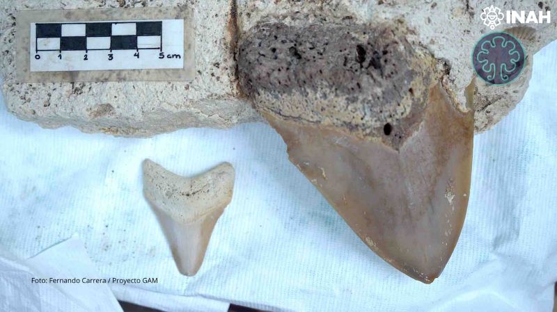Una de las piezas dentales corresponde a un ejemplar juvenil; la otra, de mayores dimensiones, similares a las de una mano humana en edad madura, se halló incrustada en un conglomerado de roca caliza que presenta otras evidencias de fósiles marinos, y se piensa perteneció a un megalodón adulto; ambas se pueden ver en la Sala 1 del Museo Regional de Costa Oriental, en Tulum, del INAH.