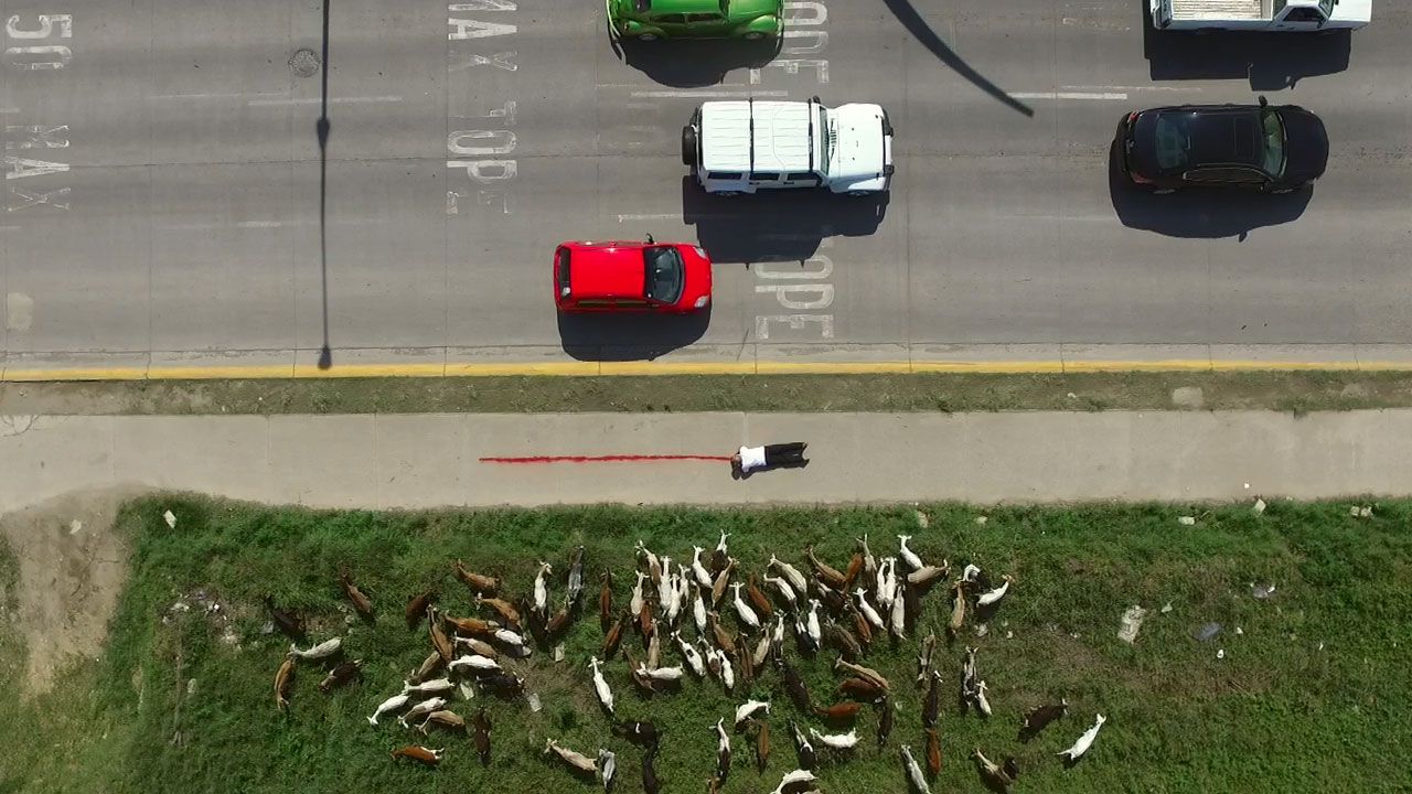 En la primera el artista recupera los momentos inmediatos al reconocimiento de la máquina voladora por quienes se saben observados. Sucede una interacción fugaz, la cual incluye desde un saludo (con el cual se verifica que el aparato es un mediador de la visión y existe un alguien, quien lo opera y observa) hasta quienes intentan bloquear su rostro ante la presencia del drone. En el segundo proyecto la visión vertical y el uso de campos monocromáticos anula las cualidades de la visión aérea al imposibilitar un exitoso reconocimiento territorial y no dejar en claro la escala de la toma. Si bien el resultado es formalmente cohesivo, revela la facilidad con la que puede sabotearse el programa del drone como herramienta de una visión total.