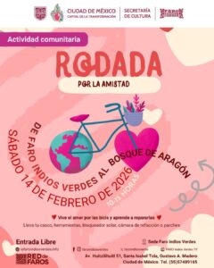 Ciudad de México.- La Fábrica de Artes y Oficios (FARO) Indios Verdes, recinto perteneciente a la Secretaría de Cultura de la Ciudad de México, invita al público a sumarse a la Rodada por la Amistad que se realizará el próximo sábado 14 de febrero, en punto de las 10:00 horas, para celebrar esta fecha a través del deporte, la convivencia y el amor por el ciclismo como práctica comunitaria y de movilidad.