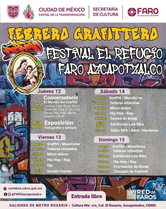 Ciudad de México.- La Ciudad de México se prepara para albergar un evento sin precedentes en la zona norte de la capital, donde el arte urbano y la convivencia comunitaria serán los protagonistas. La Fábrica de Artes y Oficios (FARO) Azcapotzalco Xochicalli, recinto perteneciente a la Secretaría de Cultura capitalina, se transformará en la sede del Festival El Refugio, un encuentro dedicado al graffiti y la cultura urbana que tendrá lugar del jueves 12 al domingo 15 de febrero de 2026.