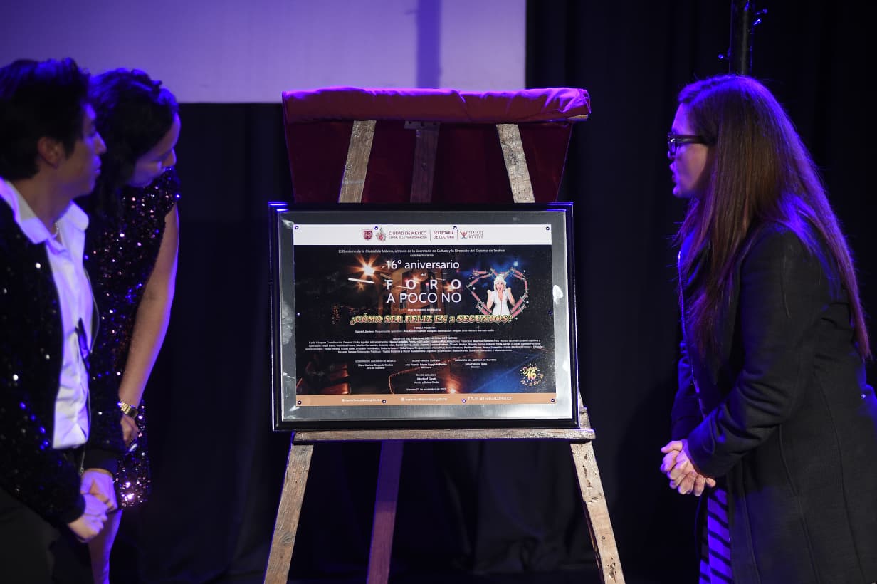 Al finalizar la función, se realizó la develación de la placa conmemorativa por el 16 aniversario. El acto estuvo encabezado por Julia Cabrera Solís, directora del Sistema de Teatros; Francisco Gabriel Ramírez Jiménez, responsable del recinto; y Marisol Gasé, integrante de Las Reinas Chulas y madrina de honor.