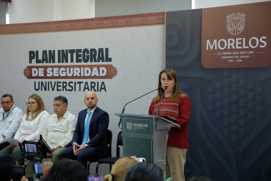 CUERNAVACA.— La gobernadora Margarita González encabezó la presentación del Plan Integral de Seguridad Universitaria, en el que participarán diversas dependencia estatales con el objetivo de que las universidades de Morelos sean espacios seguros, libres de violencia y con entornos protegidos para todas y todos los estudiantes.