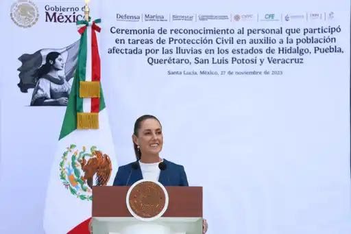 La Jefa del Ejecutivo Federal reconoció a la gobernadora de Veracruz, Rocío Nahle García; así como a los mandatarios estatales de Hidalgo, Julio Menchaca Salazar; de Puebla, Alejandro Armenta Mier; de San Luis Potosí, Ricardo Gallardo Cardona; y de Querétaro, Mauricio Kuri González, por su entrega, sacrificio y por el trabajo que realizaron en atención a la población. También realizó la entrega de condecoraciones a 120 elementos del Ejército; 30 de la Fuerza Aérea Mexicana; 120 de la Guardia Nacional y 120 de la Marina, quienes participaron en la aplicación del Plan DN-III-E y Plan Marina, respectivamente, así como reconocimientos a 65 servidores públicos que participaron en las labores ante la emergencia.