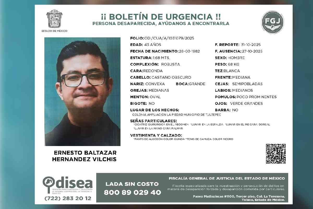TULTITLÁN.— La Fiscalía General de Justicia del Estado de México informó que el cuerpo del sacerdote Ernesto Baltazar Hernández Vilchis fue encontrado dentro de un canal de aguas negras en el municipio de Nextlalpan; por estos hechos hay dos personas detenidas, a quienes investigan por el delito de desaparición.