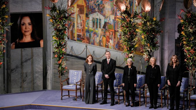 Durante la entrega del Premio, el presidente del Comité Noruego del Nobel, Jørgen Watne Frydnes, instó al presidente de Venezuela, Nicolás Maduro, a aceptar los resultados de las elecciones de 2024 y renunciar a su cargo. “Debe sentar las bases para una transición pacífica hacia la democracia. Porque esa es la voluntad del pueblo venezolano”, agregó.