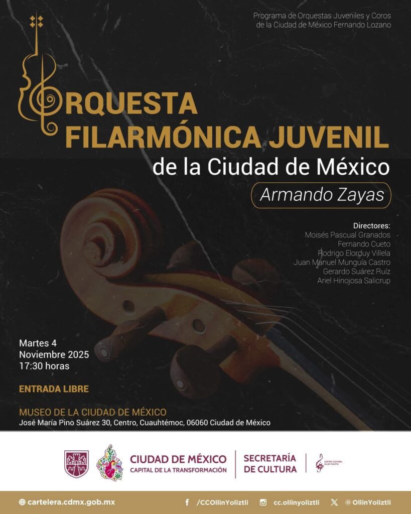 Ciudad de México.- La Orquesta Filarmónica Juvenil de la Ciudad de México Armando Zayas se presentará este martes 4 de noviembre a las 17:30 horas en el Museo de la Ciudad de México, con entrada libre para todo el público. El concierto forma parte del Programa de Orquestas Juveniles y Coros de la Ciudad de México Fernando Lozano, impulsado por la Secretaría de Cultura capitalina.