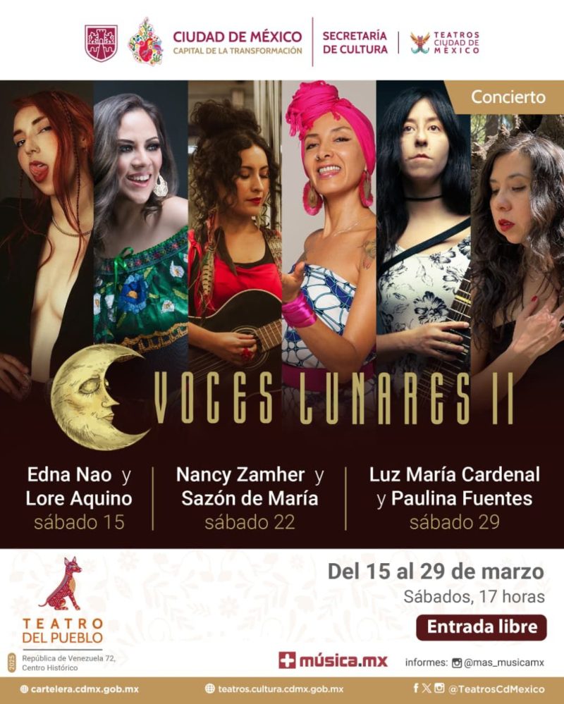 Seis visiones femeninas de la creación musical mexicana llegan a cubrir de luz y magia con su canto el Teatro del Pueblo de la Ciudad de México. Fuerza, sensibilidad y potencial creativo en un mismo escenario para celebrar la equidad y cobijadas por la luna de marzo, en un ciclo de tres conciertos denominado Voces Lunares II.