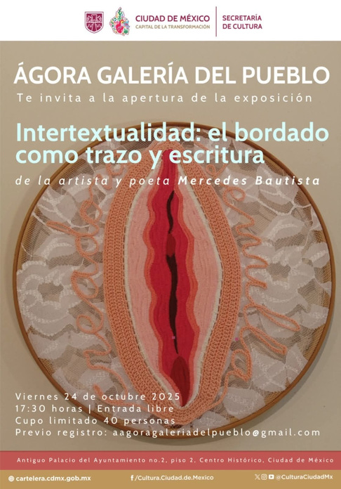 La exposición “Intertextualidad, el bordado como trazo y escritura” permanecerá abierta al público en la Ágora Galería del Pueblo, ubicada en el segundo piso del Antiguo Palacio del Ayuntamiento (Plaza de la Constitución No. 2, Centro Histórico, Alcaldía Cuauhtémoc). El acceso será gratuito, de martes a domingo en un horario de 11:00 a 17:00 horas, con cupo limitado a 40 personas.
