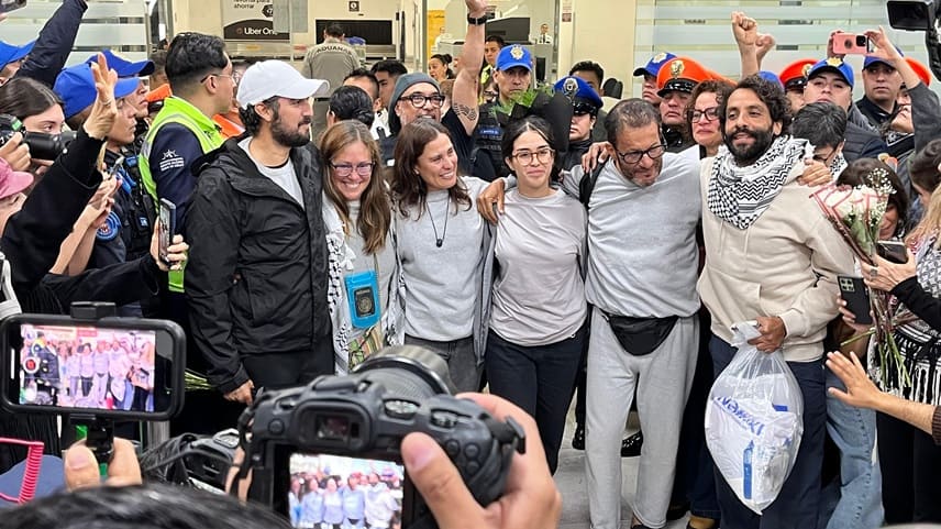 Luego de ser recibidos por la delegación de la SRE, los seis mexicanos entraron por la puerta 1 del AICM, en donde los esperaban decenas de activistas y medios de comunicación. Al grito de “Palestina libre”, cantos de “bella ciao” y aplausos, los connacionales fueron recibidos en su país.