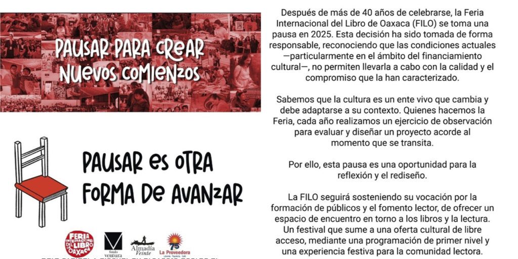 “Después de más de 40 años de celebrarse, la Feria Internacional del Libro de Oaxaca (FILO) se toma una pausa en 2025. Esta decisión ha sido tomada de forma responsable, reconociendo que las condiciones actuales –particularmente en el ámbito del financiamiento cultural– no permiten llevarla a cabo con la calidad y el compromiso que la ha caracterizado”, apuntaron.