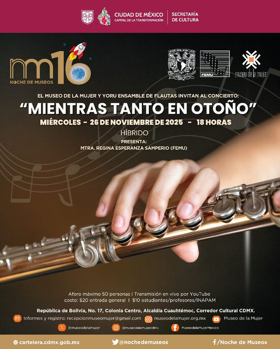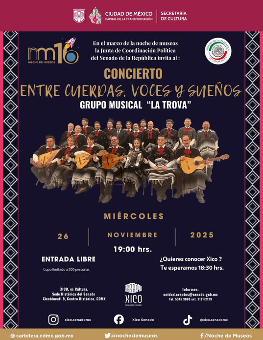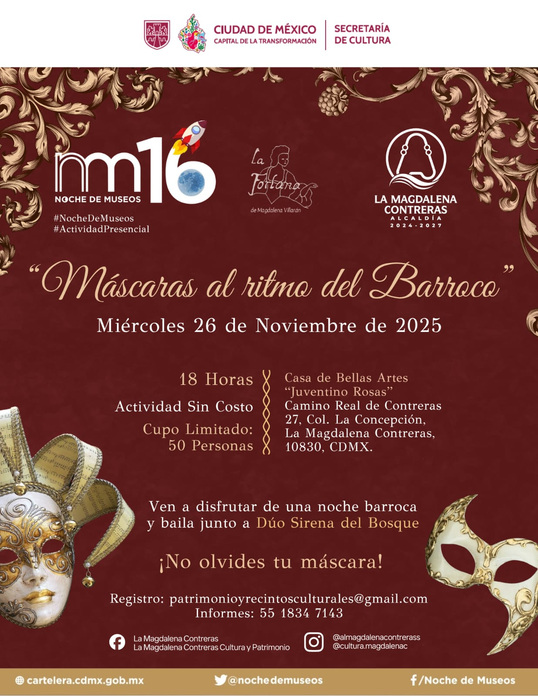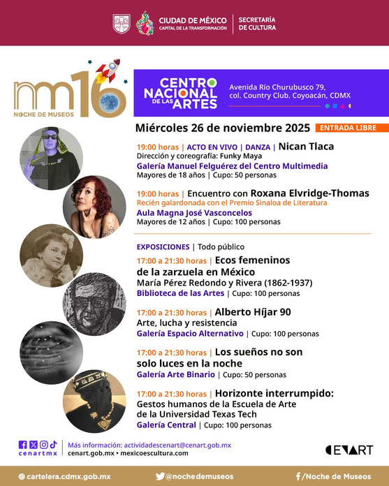 Entre las incorporaciones recientes destaca la propuesta de la Alcaldía Magdalena Contreras, que invita a disfrutar la velada “Máscaras al ritmo del Barroco”, protagonizada por el Dúo Sirenas del Bosque a partir de las 18 horas. Asimismo, la Dirección de Difusión del IPN ofrecerá una charla dedicada a murales, códices y arte en Zacatenco desde las 17 horas.