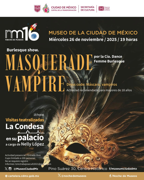 La oferta cultural se amplía con actividades como el concierto tributo a Carlos Santana en el Museo Yancuic; la exposición “Mirar desde dentro: Autismo y fotografía” de Iván Macías en el Museo Archivo de la Fotografía; y el Burlesque Show “Masquerade Vampire” en el Museo de la Ciudad de México, dirigido a mayores de 18 años y con código de vestimenta especial.