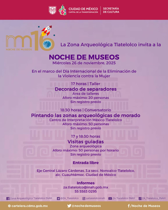 Para quienes buscan experiencias con narrativa histórica, el Museo del Telégrafo tendrá una velada de indie folk y el Museo de la Inquisición presentará su recorrido “Los tres lamentos de La Llorona”, mientras que la Zona Arqueológica de Tlatelolco ofrecerá talleres y conversatorios con enfoque de género.
