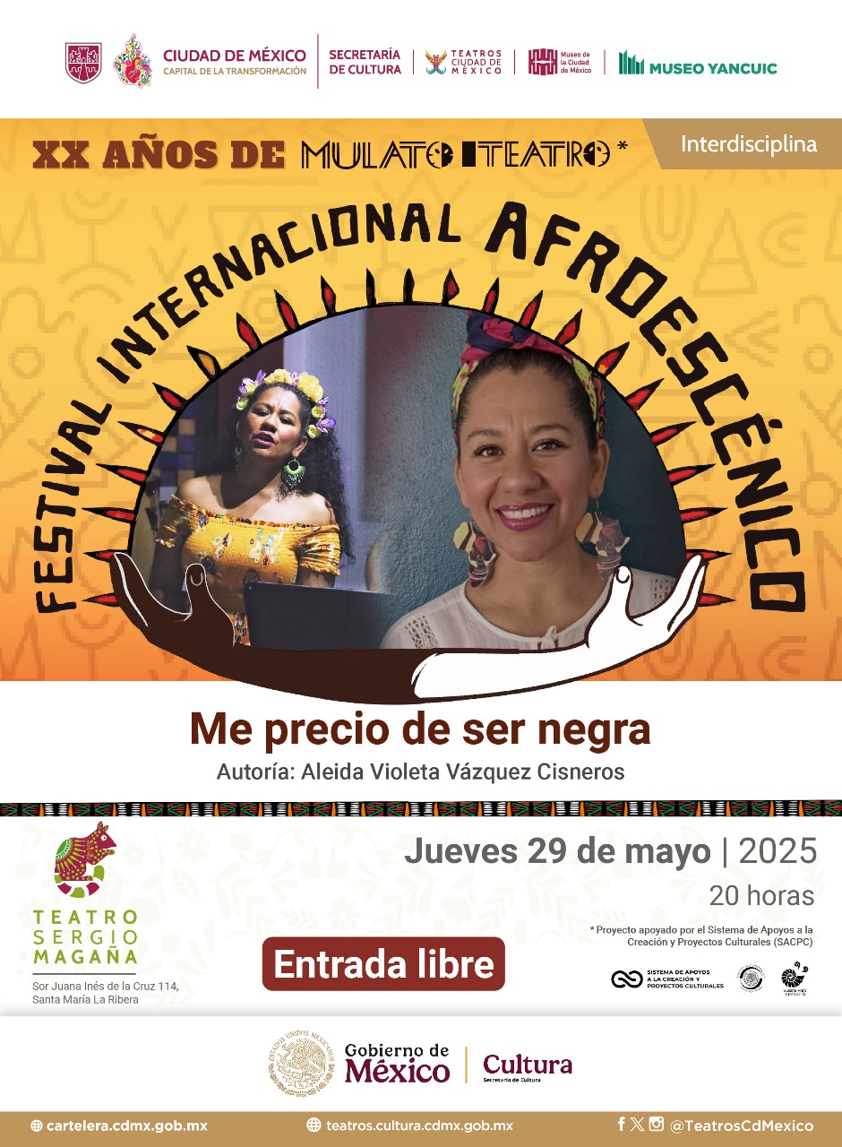 Ciudad de México.- La Secretaría de Cultura del Gobierno de México, en colaboración con la Secretaría de Cultura de la Ciudad de México y la Compañía Mulato Teatro, presentan el Primer Festival Internacional Afroescénico, una plataforma artística y política que busca visibilizar a las comunidades afrodescendientes mediante el arte escénico. El festival se llevará a cabo del 22 de mayo al 1 de junio de 2025, con presentaciones en distintos recintos culturales de la capital.