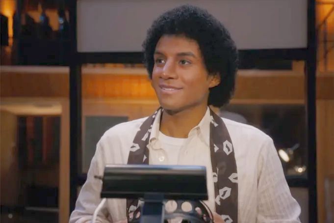 Luego vemos brevemente por primera vez a Jaafar como MJ, antes de que la escena cambie a una multitud enorme en un estadio lleno, Jackson con su icónica chaqueta brillante de Thriller y su guante blanco de lentejuelas, la familia Jackson riendo alrededor de la mesa del comedor y un montaje rápido de Jackson promocionando lo que se convertiría en el álbum más vendido de todos los tiempos mientras decide el orden de las canciones en una pizarra de corcho.