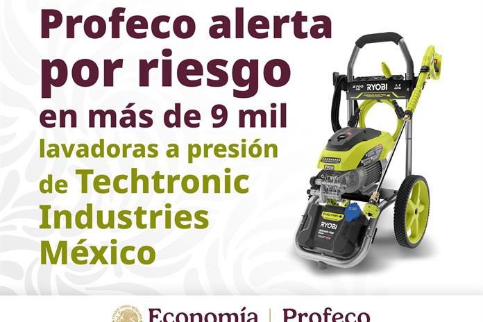 CIUDAD DE MÉXICO.- La Procuraduría Federal del Consumidor (Profeco) y Techtronic Industries México alertan del retiro del mercado y reparación de 9 mil 014 lavadoras a presión marca Ryobi modelo RY142300 presión eléctrica 2300 PSI y modelo RY142711VNM presión eléctrica 2700 PSI.