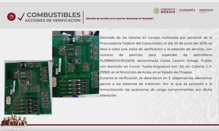 Sheffield señaló que de nueva cuenta se encontró un rastrillo, dispositivo utilizado para controlar a distancia la cantidad de combustible despachado, en tres bombas de una gasolinera localizada en el municipio de Acala, Chiapas, por lo que dichas estaciones fueron inmovilizadas.
