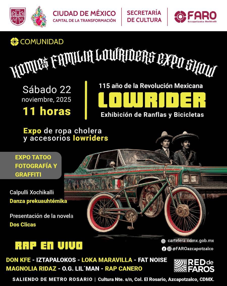 El primer festival “Homie$ Familia Lowrider Show”, se llevará a cabo el sábado 22 de noviembre, de 11 a 21 horas, en la FARO Azcapotzalco Xochicalli, ubicada en Avenida Cultura Norte s/n, Unidad Habitacional El Rosario, Alcaldía Azcapotzalco.