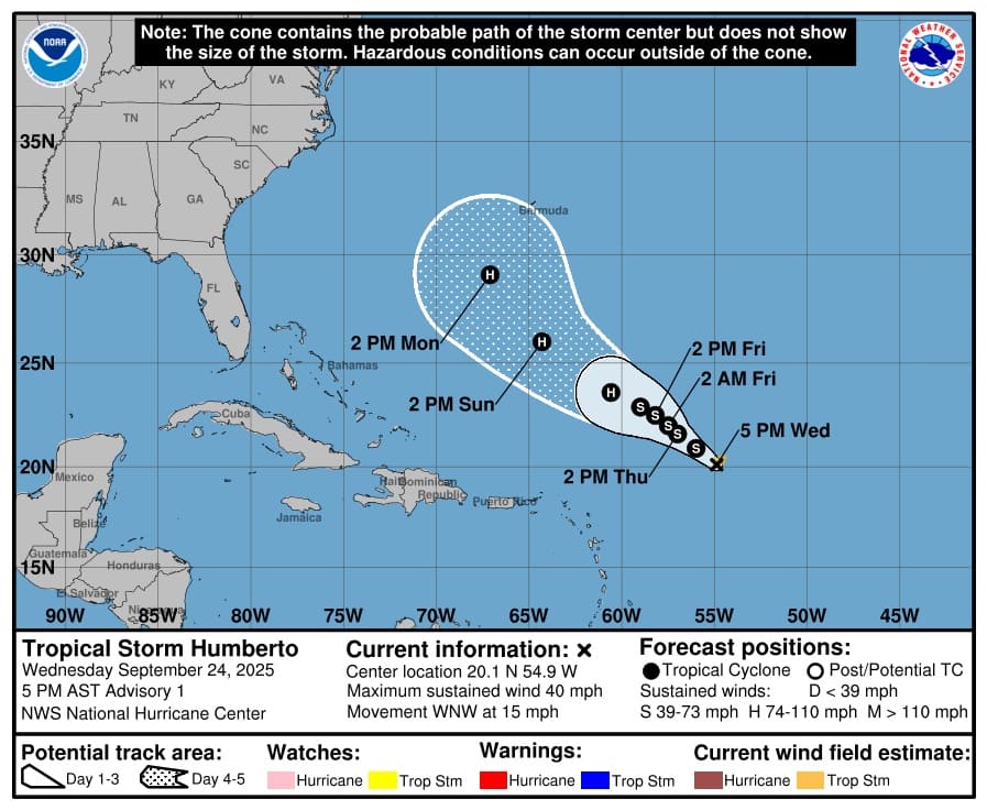 CIUDAD DE MÉXICO.— La tormenta tropical Humberto, el octavo ciclón de la actual temporada del Atlántico, se formó este miércoles; se prevé que pueda convertirse en huracán a partir del sábado. Debido a su distancia y trayectoria, no representa peligro para el territorio mexicano.