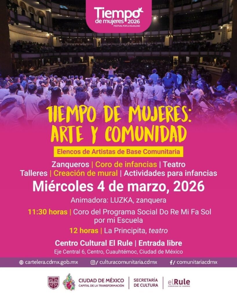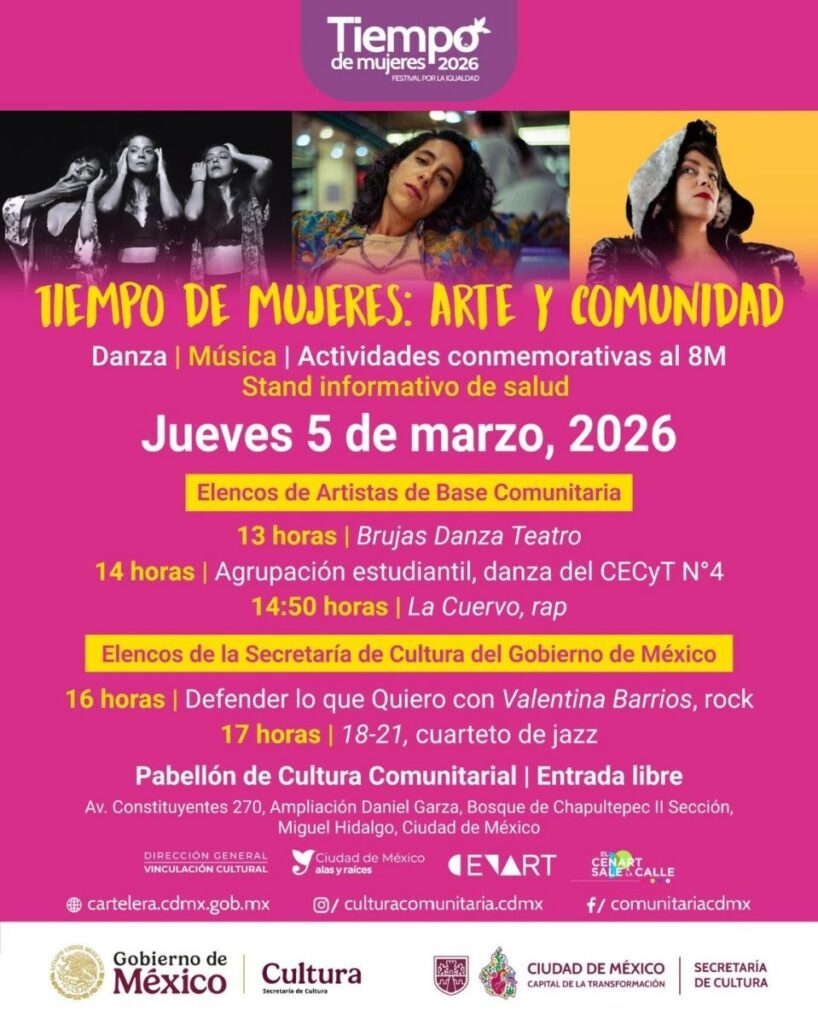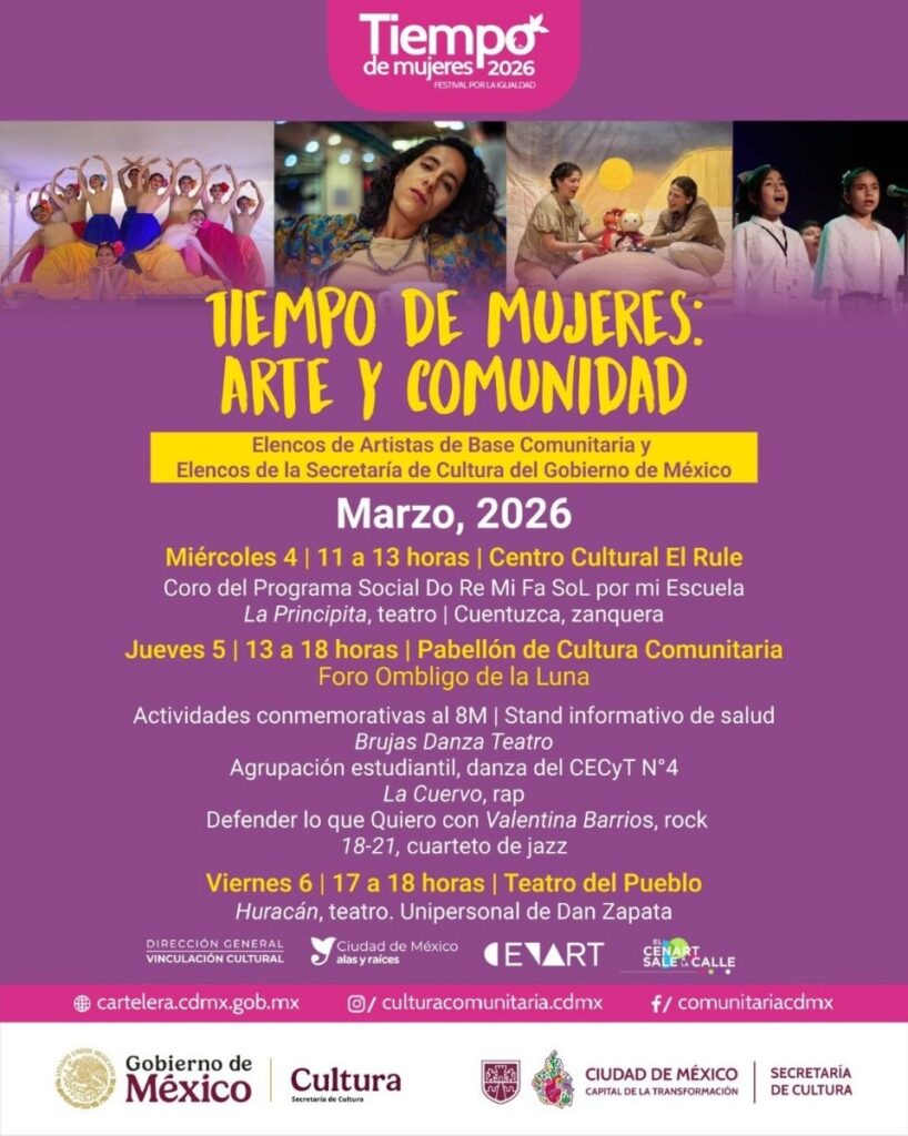 Ciudad de México.-  La Ciudad de México se transforma en un escenario de expresión y reivindicación con el inicio de “Tiempo de Mujeres. Festival por la Igualdad 2026”. Del 4 al 6 de marzo, la Secretaría de Cultura local desplegará una jornada de tres días que entrelaza la música, el teatro y la danza para conmemorar el Día Internacional de las Mujeres. Esta iniciativa no solo busca celebrar el arte, sino visibilizar el talento femenino desde el ámbito comunitario, integrando programas sociales que democratizan el acceso a la cultura en todas las demarcaciones de la metrópoli.