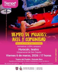Para finalizar este ciclo conmemorativo, el viernes 6 de marzo el Teatro del Pueblo recibirá la obra “Huracán”. Esta pieza es un unipersonal interpretado por Dan Zapata, que cuenta con la dirección y el diseño sonoro de Elizabeth Pedroza. La función, programada a las 17:00 horas, promete ser un cierre reflexivo y potente para el festival, utilizando el lenguaje corporal y sonoro para transmitir mensajes de resiliencia y empoderamiento femenino en la actualidad.