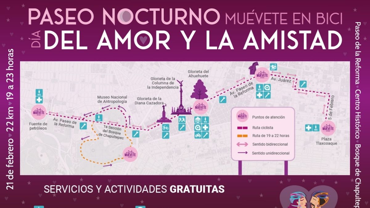 Ciudad de México.- La Secretaría de Movilidad (SEMOVI) ha lanzado una convocatoria abierta para que ciclistas, corredores y peatones se unan al primer Paseo Nocturno “Muévete en Bici” de 2026. Este evento, diseñado para conmemorar el Día del Amor y la Amistad, se llevará a cabo el sábado 21 de febrero, transformando las calles de la capital en un espacio de convivencia desde las 19:00 hasta las 23:00 horas.