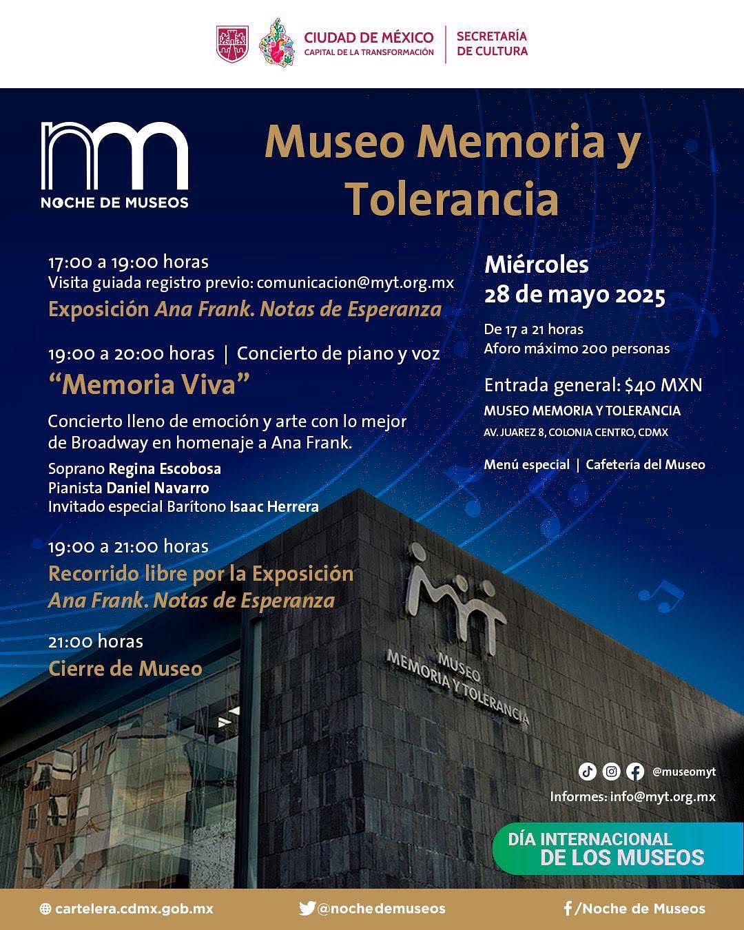 En esta edición, se suman espacios emblemáticos como El Colegio Nacional, que ofrecerá visitas guiadas y una charla especial para el público asistente. Asimismo, el Museo de Memoria y Tolerancia presentará una exposición temporal sobre la vida de Ana Frank, con visitas guiadas entre las 17:00 y las 19:00 horas, recorridos libres hasta las 21:00 y un concierto con lo mejor de Broadway a las 19:00 horas. También se integra el Museo Nacional de la Cruz Roja Mexicana, con recorridos guiados y acceso libre a sus instalaciones históricas.