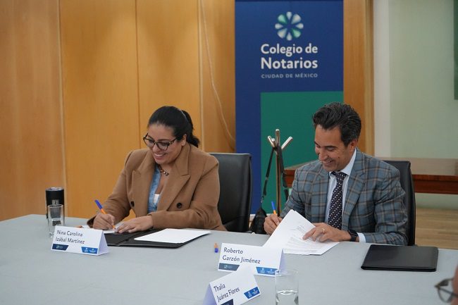 La firma se llevó a cabo en las instalaciones del Colegio de Notarios de la Ciudad de México y contó con la participación de la Mtra. Nina Carolina Izábal Martínez, presidenta del Consejo Directivo del ECUM, y del Dr. Roberto Garzón Jiménez, presidente del Consejo Directivo del Colegio de Notarios de la CDMX. Como testigos signaron la Mtra. Thalía Juárez Flores, primera secretaria propietaria del ECUM, y el Mtro. Ángel Gilberto Adame López, director general del IIJN.
