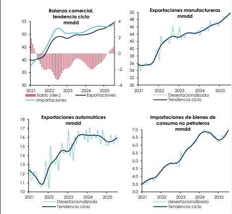 La evolución de la balanza comercial muestra un entorno más favorable que en años previos, con fortaleza en las exportaciones manufactureras como motor externo, mientras que la moderación de las importaciones evidencia debilidad en la demanda interna.