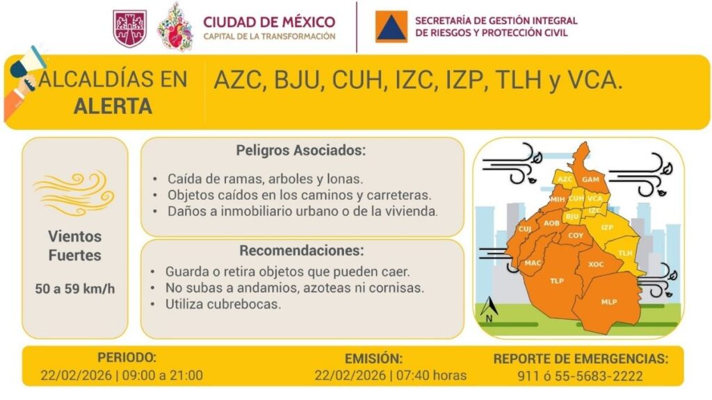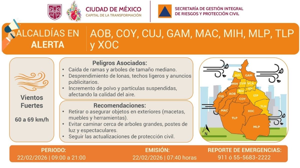 La Secretaría de Gestión Integral de Riesgos y Protección Civil (SGIRPC) informó que se activa Alerta Naranja por pronóstico de vientos fuertes, con rachas que pueden alcanzar hasta los 60 kilómetros por hora (km/h), en las demarcaciones: Álvaro Obregón, Coyoacán, Cuajimalpa, Gustavo A. Madero, Magdalena Contreras, Miguel Hidalgo, Milpa Alta, Tlalpan y Xochimilco. Este nivel de alerta sugiere riesgos por caída de ramas, lonas o estructuras ligeras, por lo que se recomienda asegurar objetos en exteriores.